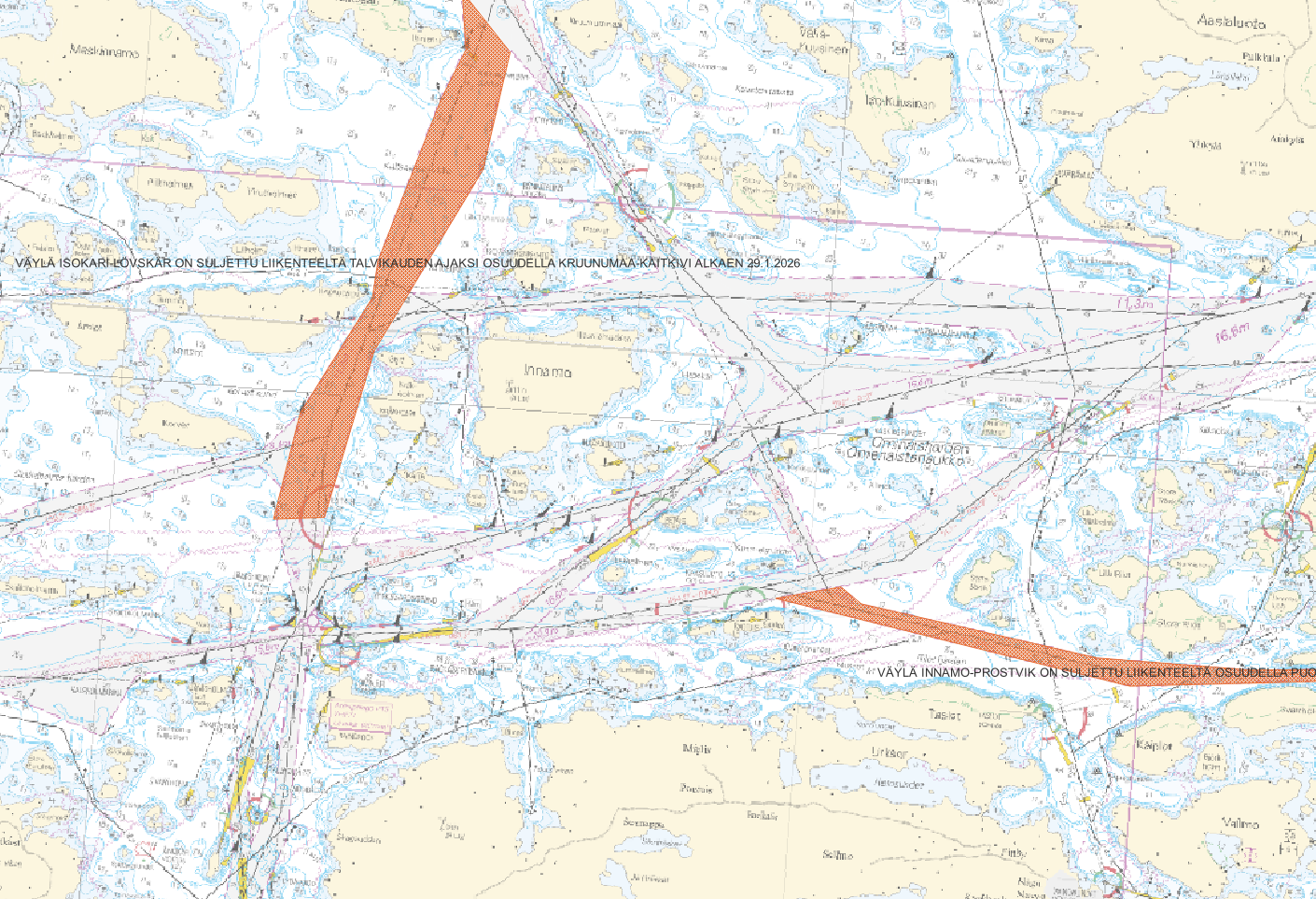 Sisältää seuraavat karttatasot: Voimassa olevat merivaroitukset, pistemäiset kohteet (tason tekninen nimi: navigational_warnings_p) Voimassa olevat merivaroitukset, viivamaiset kohteet (tason tekninen nimi: navigational_warnings_l) Voimassa olevat merivaroitukset, aluemaiset kohteet (tason tekninen nimi: navigational_warnings_a) Aineisto sisältää Traficomin julkaisemat, aineiston hakuhetkellä voimassa olevat merivaroitukset perustuen Traficomin julkaisemaan merivaroitusohjeeseen. Muodostaakseen kokonaisuuden voimassa olevista merivaroituksista, on kaikki kolme karttatasoa huomioitava. Huom! Verkkopalvelussa olevat tiedot saattavat päivittyä viivästyneesti. Merivaroitusten saatavuus tämän palvelun kautta ei vapauta alusten päälliköitä vaatimuksesta vastaanottaa merivaroituksia IMO:n/IHO:n hyväksymien lähetysjärjestelmien kautta.